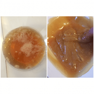 Mélangez le sucre et l’eau dans une casserole, puis faites chauffer doucement. Remuez régulièrement jusqu’à ce que le mélange devienne limpide. Si vous souhaitez parfumer la cire, ajoutez l’hydrolat de fleur d’oranger, puis versez le jus de citron. Surveillez la cuisson ; le but est d’obtenir une couleur caramel dorée, ni trop pâle ni trop foncée. Quand la texture semble au rendez-vous, retirez du feu et transférez dans un récipient en verre résistant à la chaleur.