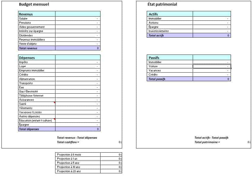 Sur la droite, la partie patrimoine prend forme. Dans la colonne « Actifs », vous inscrivez tout ce que vous possédez et qui a de la valeur, maison, épargne, placements. Si votre logement est remboursé, il figure ici ; sinon, le capital restant dû apparaît dans « Passifs », au même titre que les autres dettes. Idéalement, chaque mois, vos remboursements réduisent vos passifs et votre actif progresse. Ce suivi donne une vue d’ensemble et permet des choix éclairés.