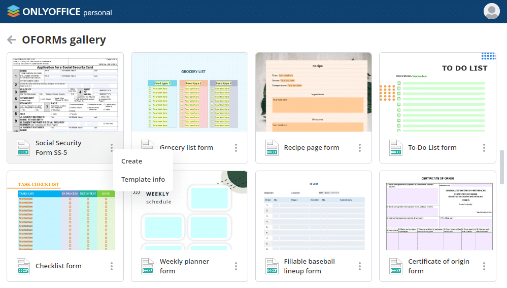 ONLYOFFICE Personal permet de créer des formulaires plus rapidement en utilisant les modèles disponibles dans la bibliothèque gratuite qui est intégrée.