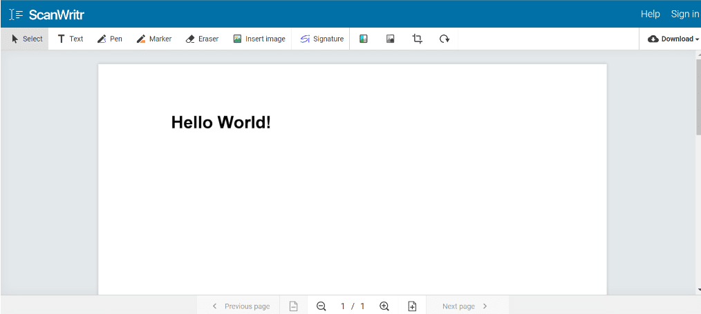 ScanWritr peut être utilisé pour éditer des documents de différents types. Il possède une interface minimaliste et des fonctionnalités très simples qui vous permettent d’ajouter des annotations et des signatures, d’utiliser un stylo ou un marqueur, d’insérer des images et de remplir les espaces vides de votre document à l’aide de l’outil d’écriture. En revanche, vous ne pouvez pas modifier le texte existant. Toutes ces fonctionnalités sont accessibles sans inscription.